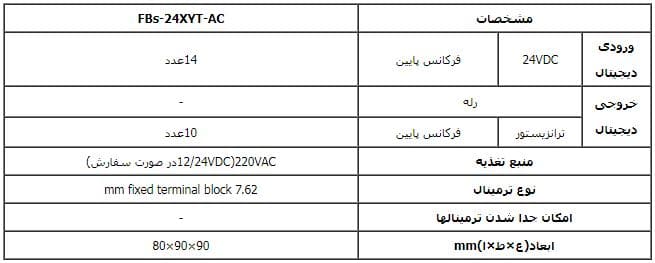 کارت ماژول گسترش ورودی و خروجی دیجیتال FATEK مدل FATEK FBS-24XYT-AC دارای 14 ورودی و 10 خروجی دیجیتال می باشد که خروجی آن از نوع ترانزیستوری و ولتاژ تغذیه آن 24 ولت DC و دارای منبع تغذیه داخلی می باشد. این کارت ماژول قابل گسترش از سمت راست می باشد و این کارت ماژول گسترش FATEK PLC برای سری های FBS (MB/MA-MC-MN) طراحی و ساخته شده است.
