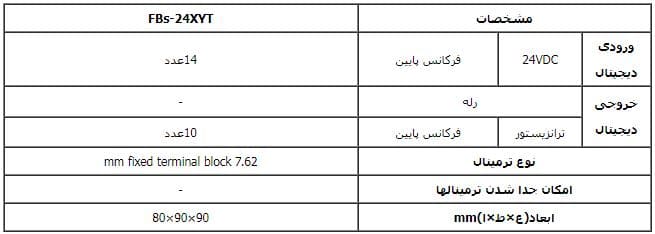 کارت ماژول گسترش ورودی و خروجی دیجیتال FATEK مدل FATEK FBS-24XYT دارای 14 ورودی و 10 خروجی دیجیتال می باشد که خروجی آن از نوع ترانزیستوری می باشد. ولتاژ تغذیه آن 24 ولت DC و قابل گسترش از سمت راست می باشد. کارت ماژول گسترش FATEK PLC برای سری های FBS (MB/MA-MC-MN) طراحی و ساخته شده است.