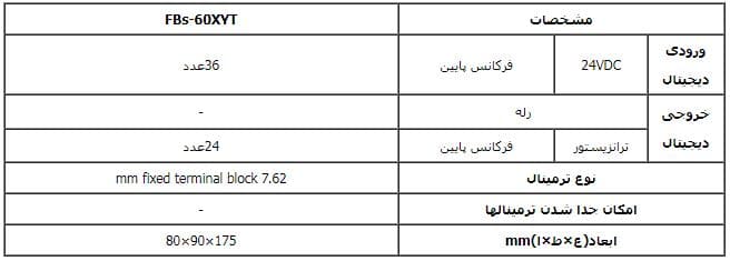 کارت ماژول گسترش ورودی و خروجی دیجیتال FATEK مدل FATEK FBS-60XYT دارای 36 ورودی و 24 خروجی دیجیتال می باشد که خروجی آن از نوع ترانزیستوری می باشد. ولتاژ تغذیه آن 24 ولت DC و قابل گسترش از سمت راست می باشد. کارت ماژول گسترش FATEK PLC برای سری های FBS (MB/MA-MC-MN) طراحی و ساخته شده است.